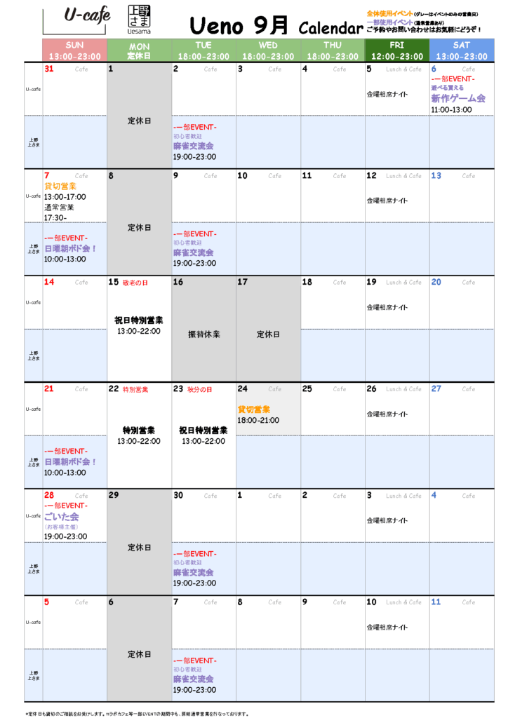 *隣接する姉妹店、上さま上野店と共通のカレンダーになっています。
