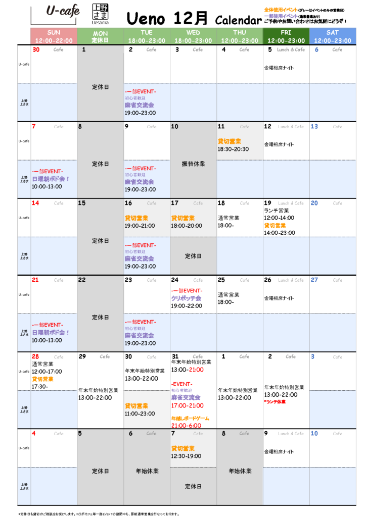 日曜:12:00-22:00(スタートと終了を共に1時間早くしました)