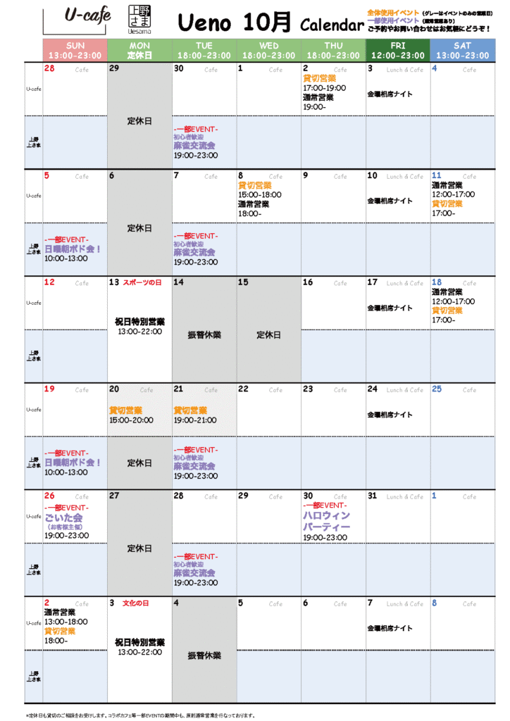 *隣接する姉妹店、上さま上野店と共通のカレンダーになっています。