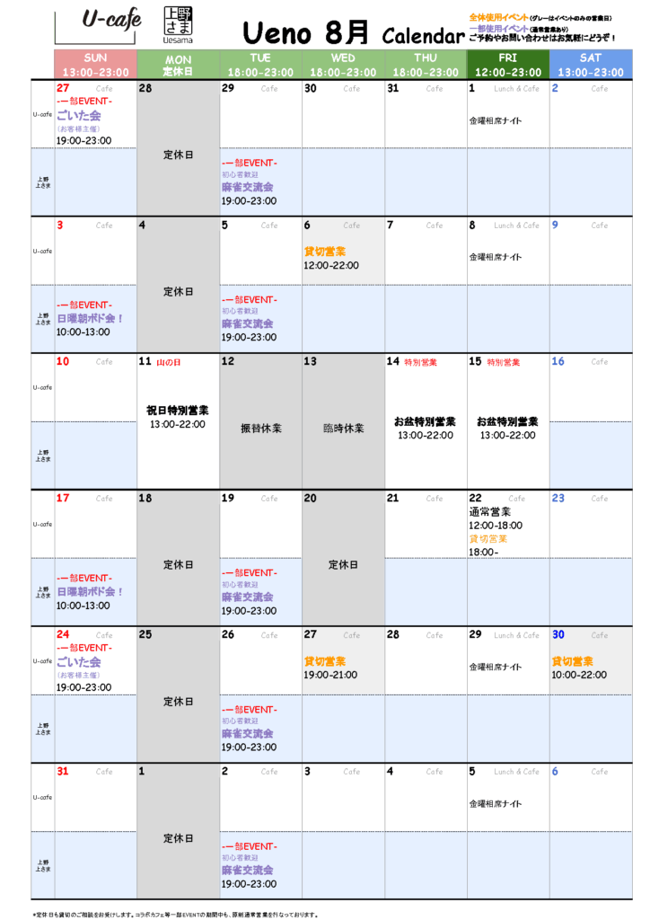 *隣接する姉妹店、上さま上野店と共通のカレンダーになっています。